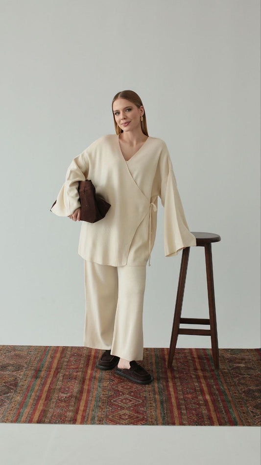 طقم بلوزة ربط مع بنطلون بيج - KP1396