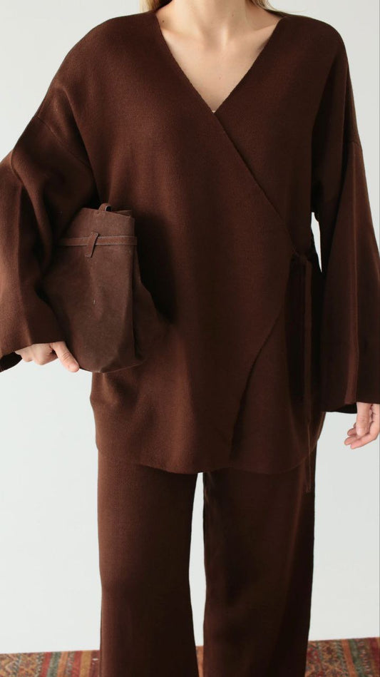 طقم بلوزة ربط مع بنطلون بني - KP1443