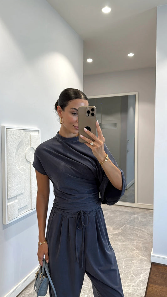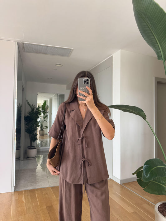 طقم بلوزة ربط مع بنطلون بني - KP1356