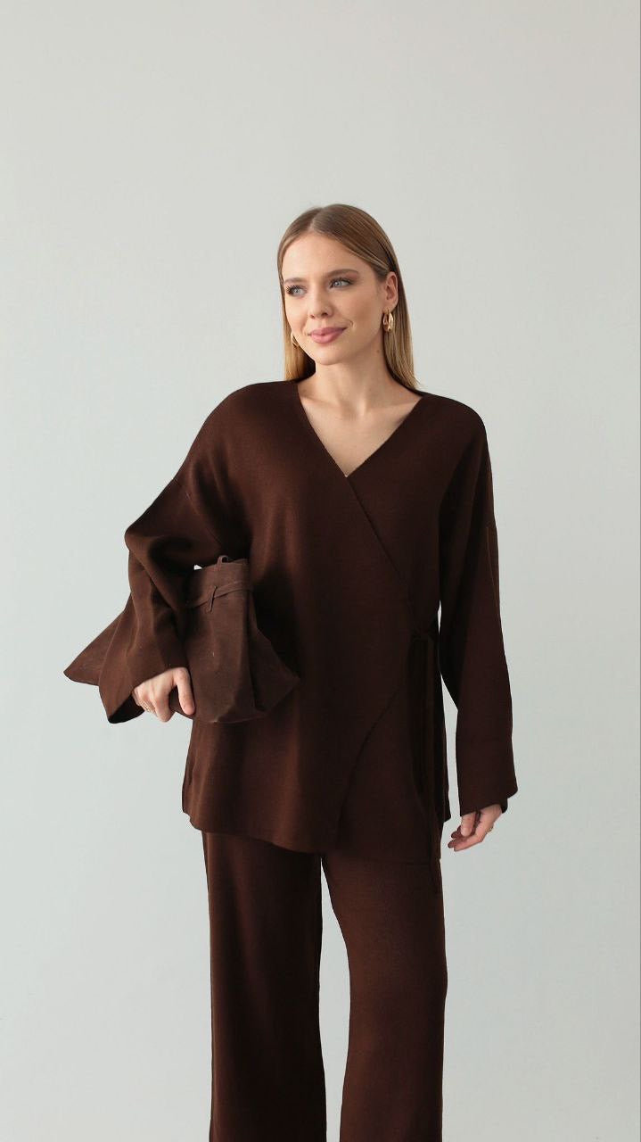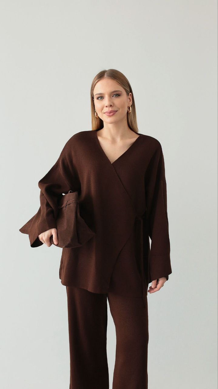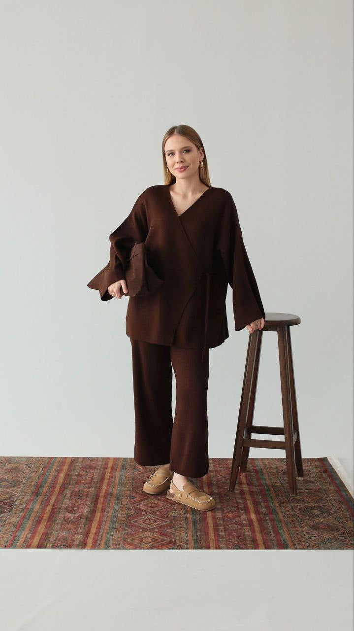 طقم بلوزة ربط مع بنطلون بني - KP1443