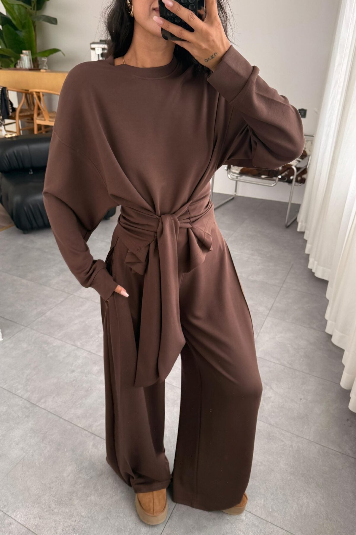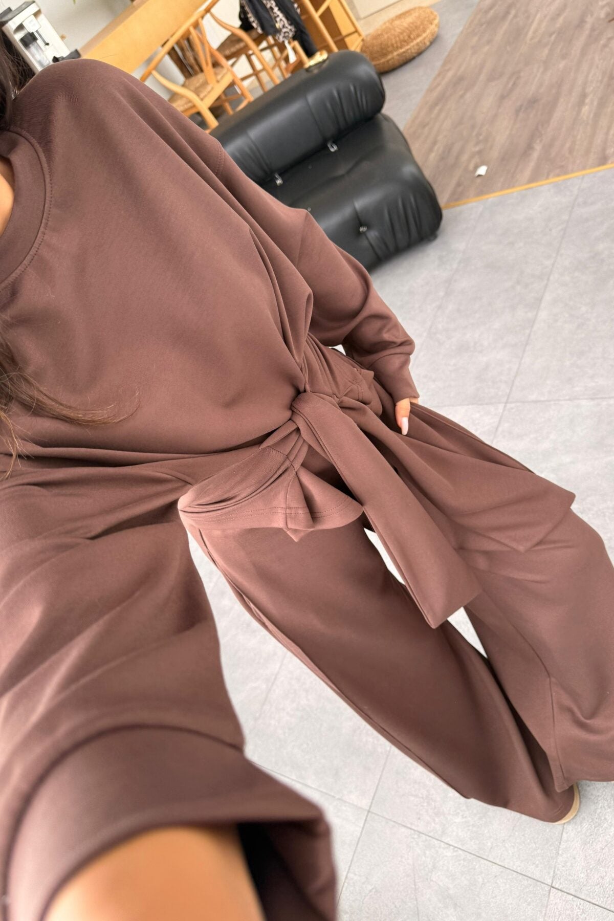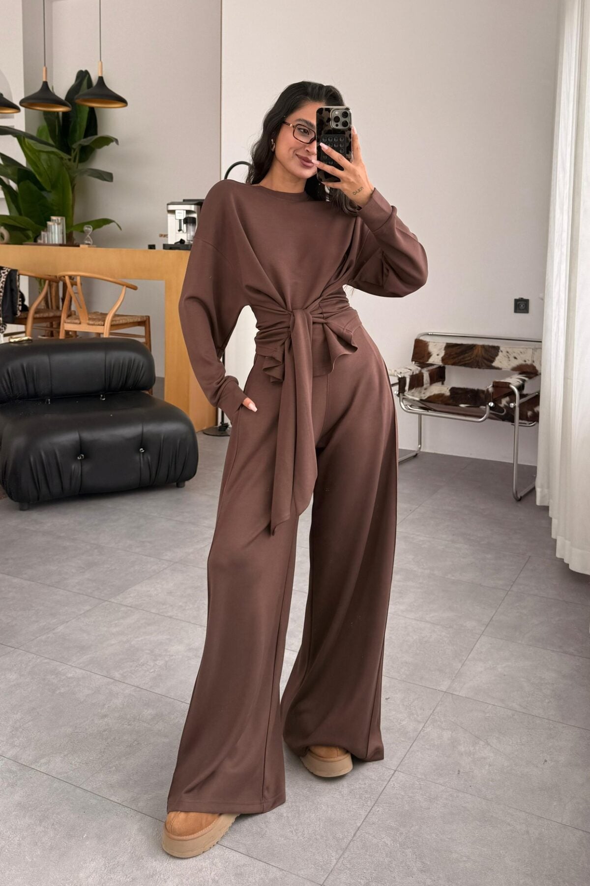طقم بلوزة ربط مع بنطلون بني - KP1396