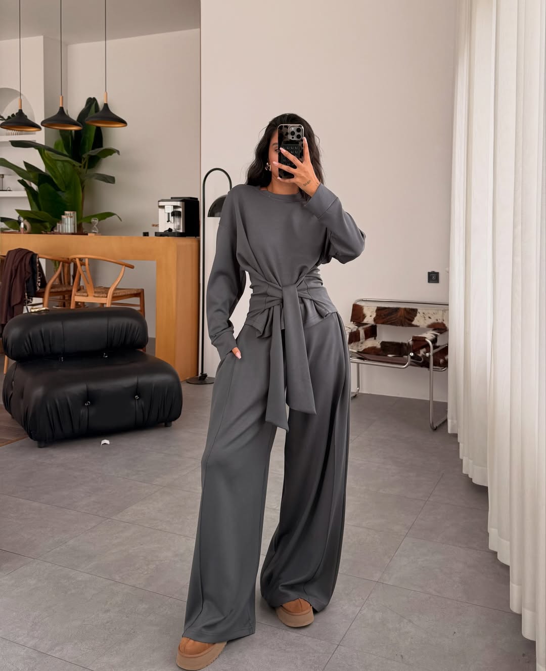طقم بلوزة ربط مع بنطلون رمادي - KP1396