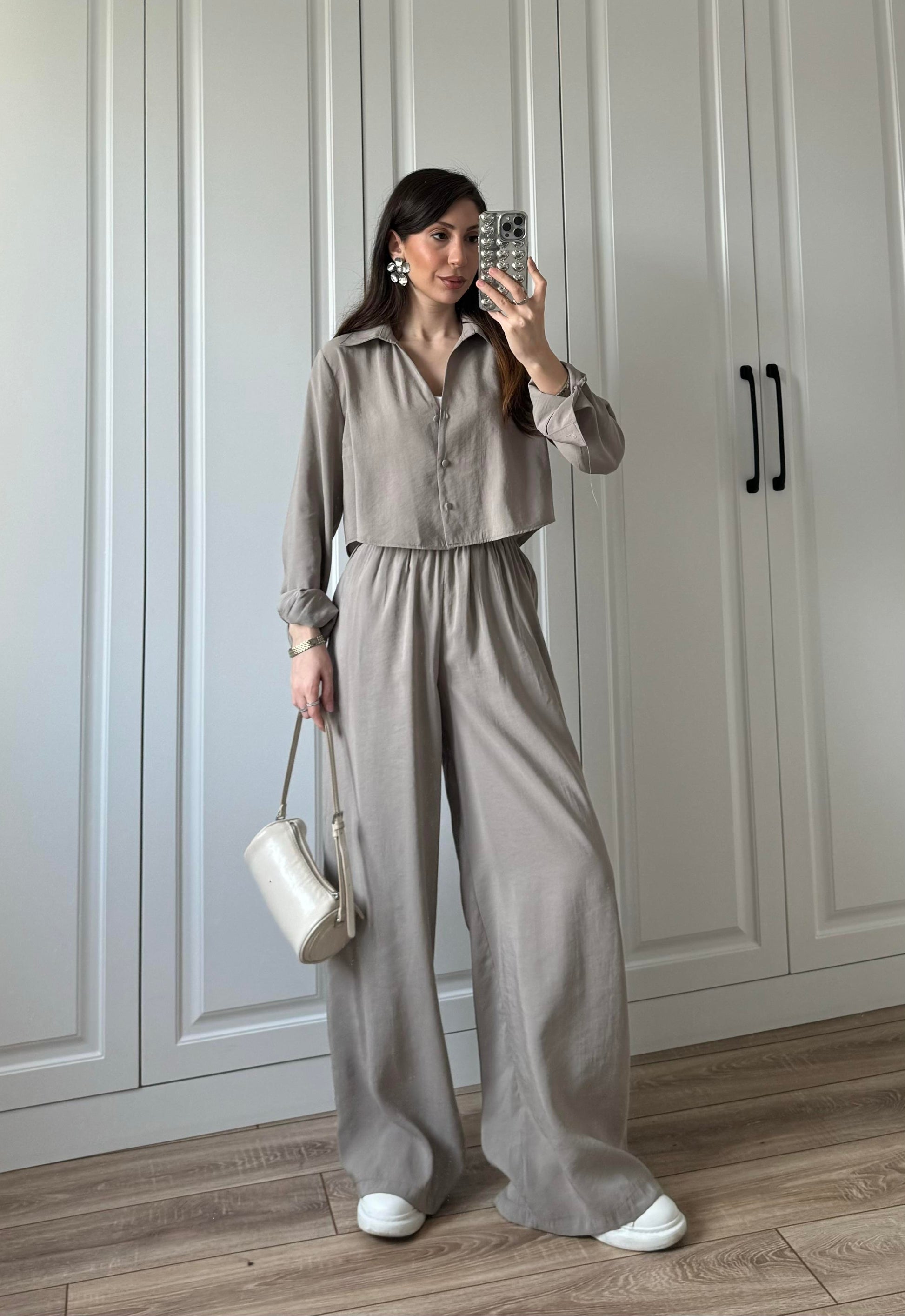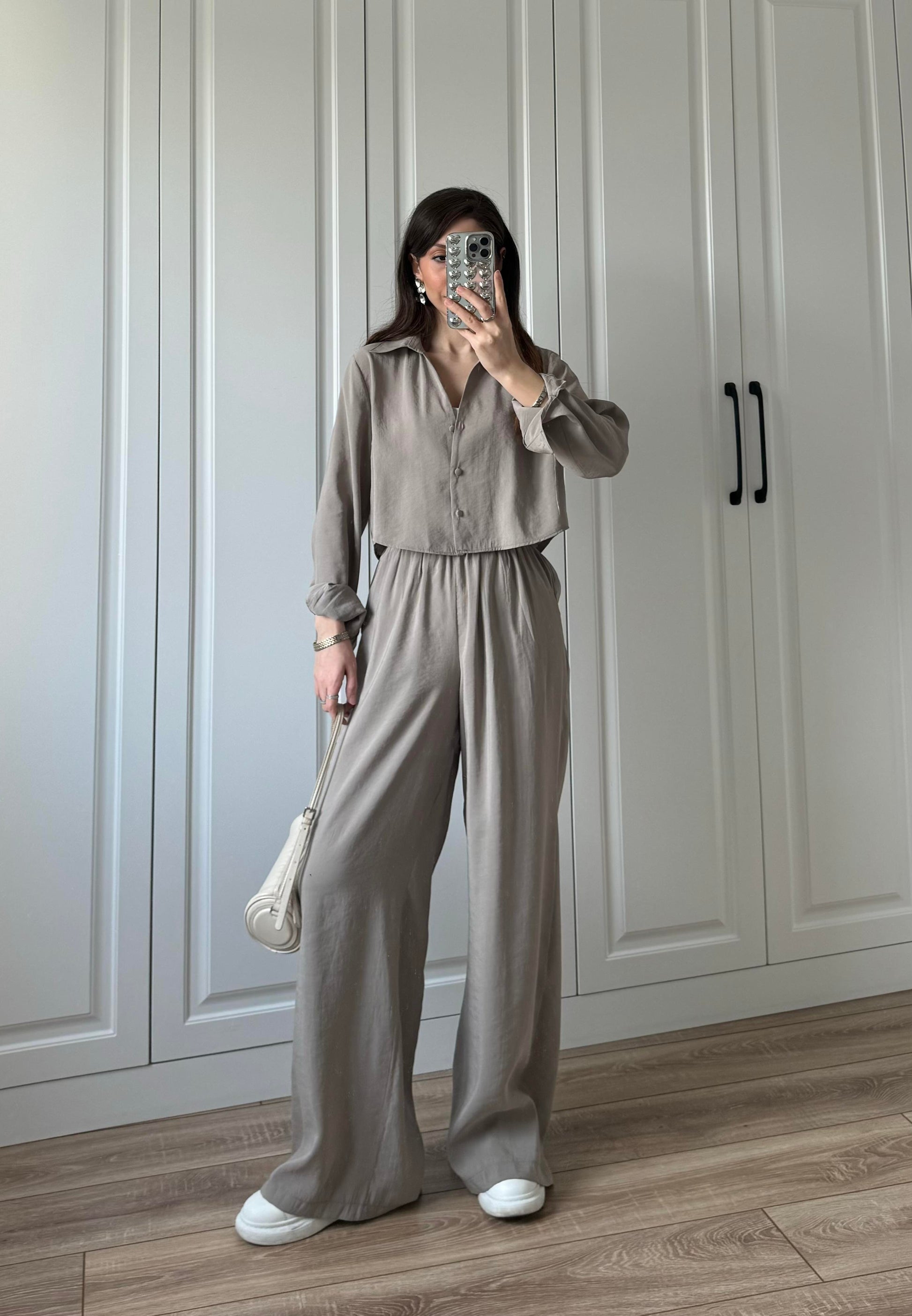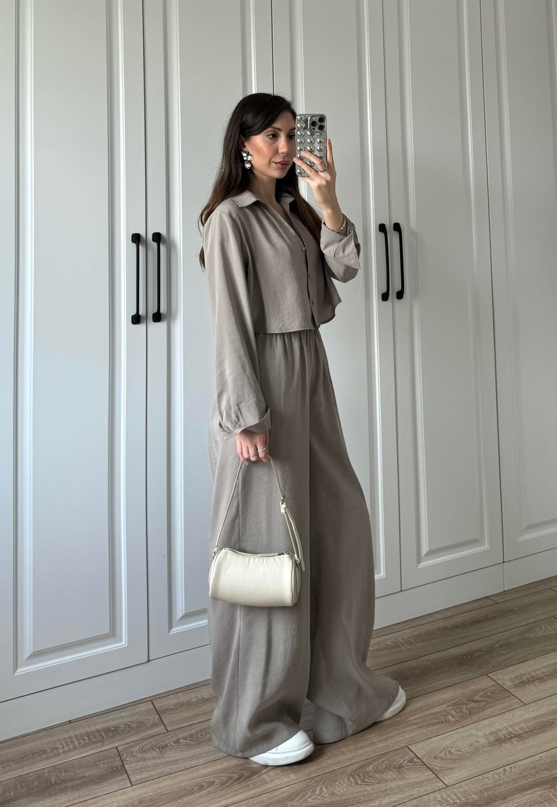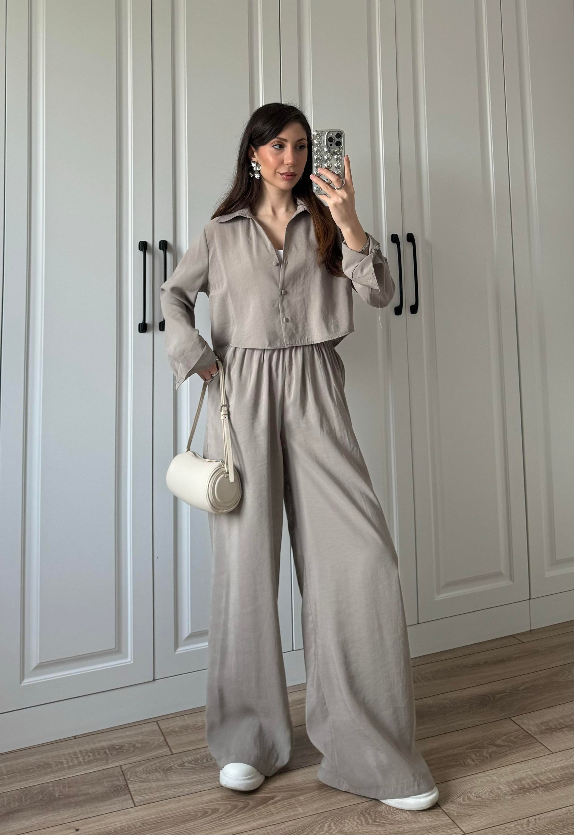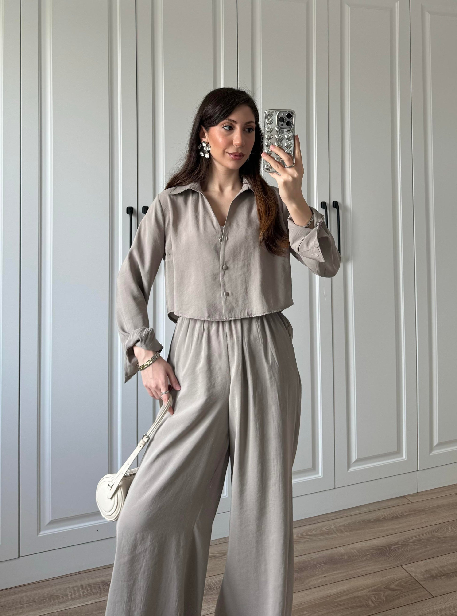 طقم قميص مع بنطلون بيج غامق - KP1327