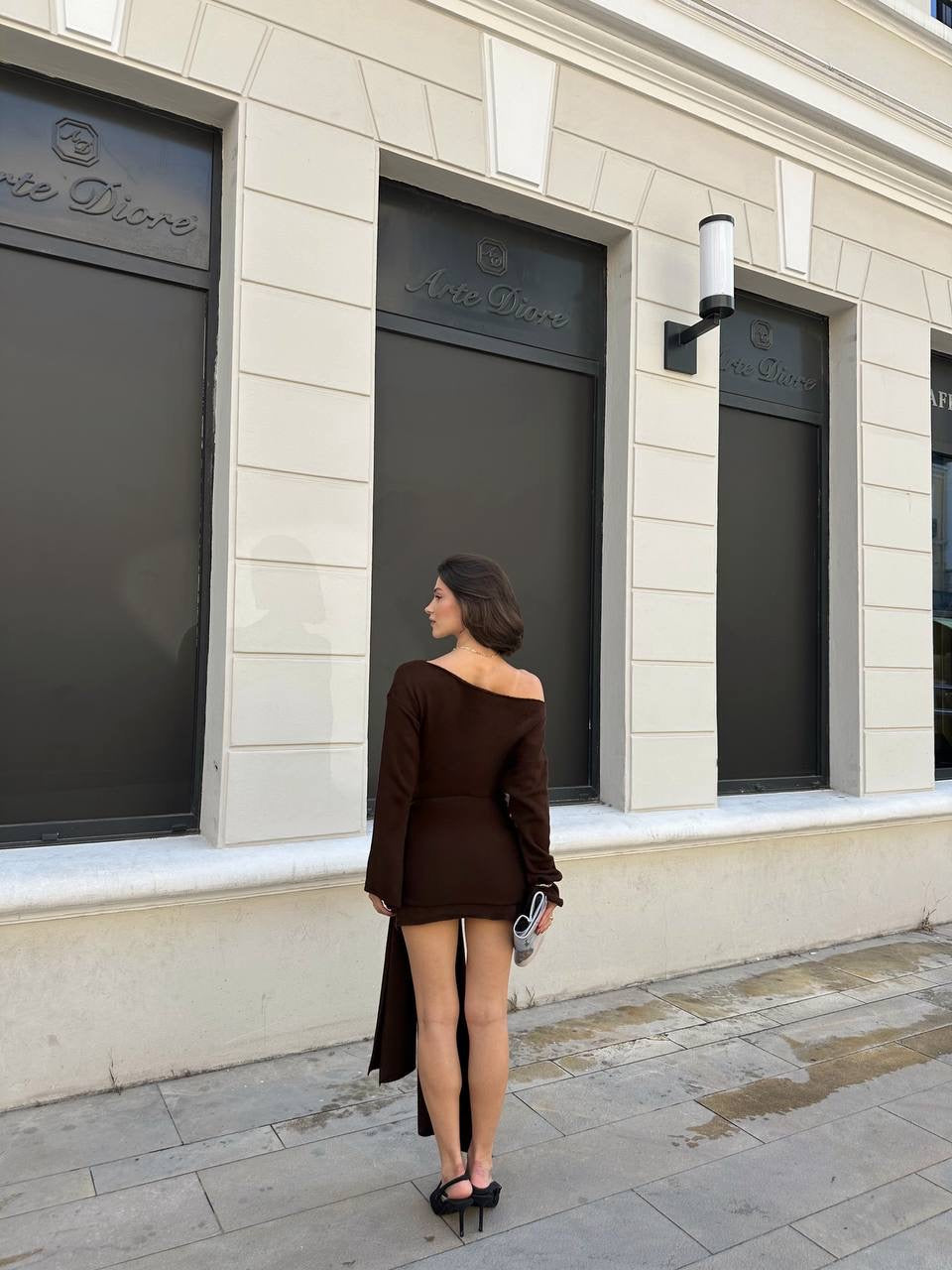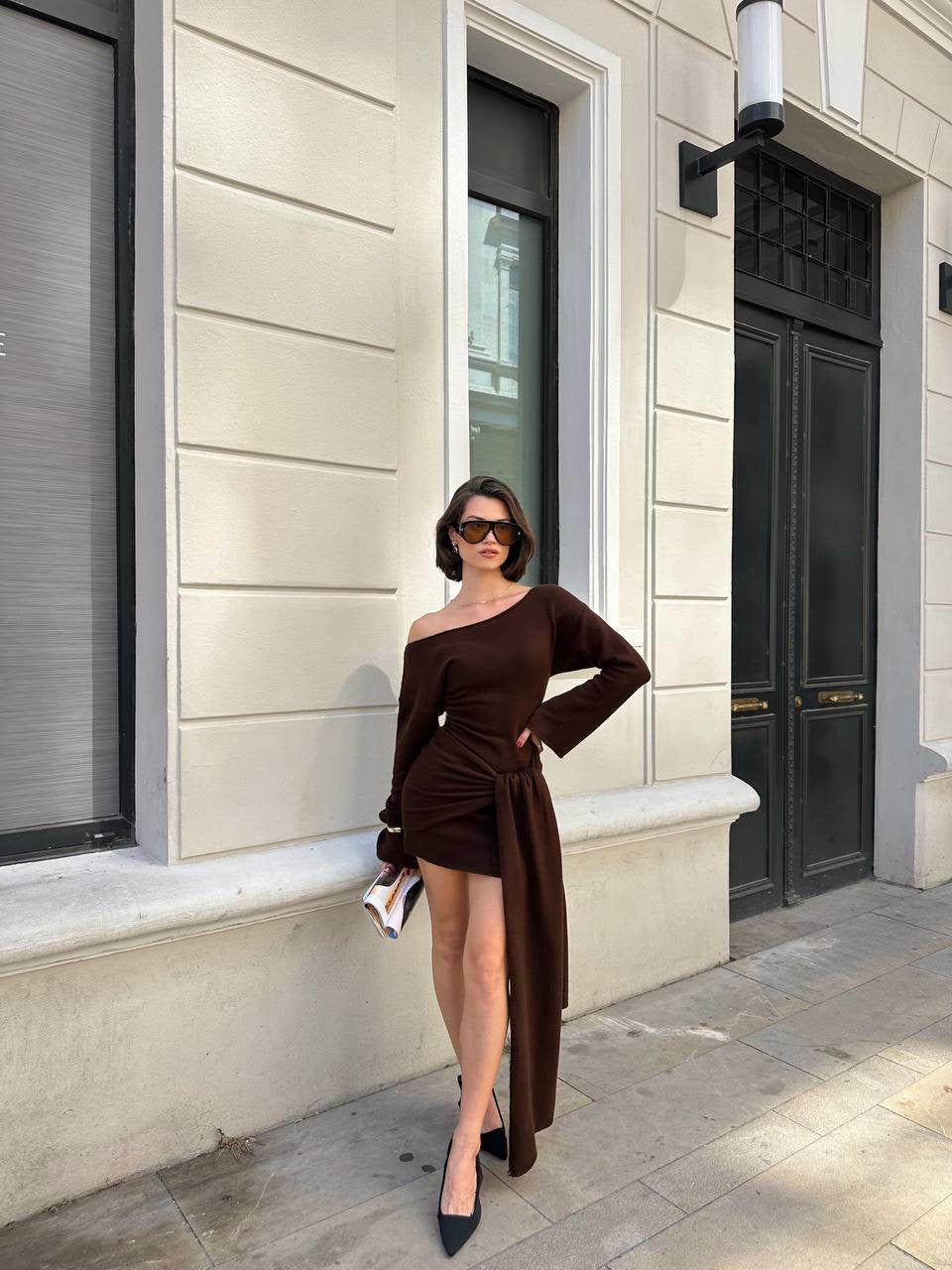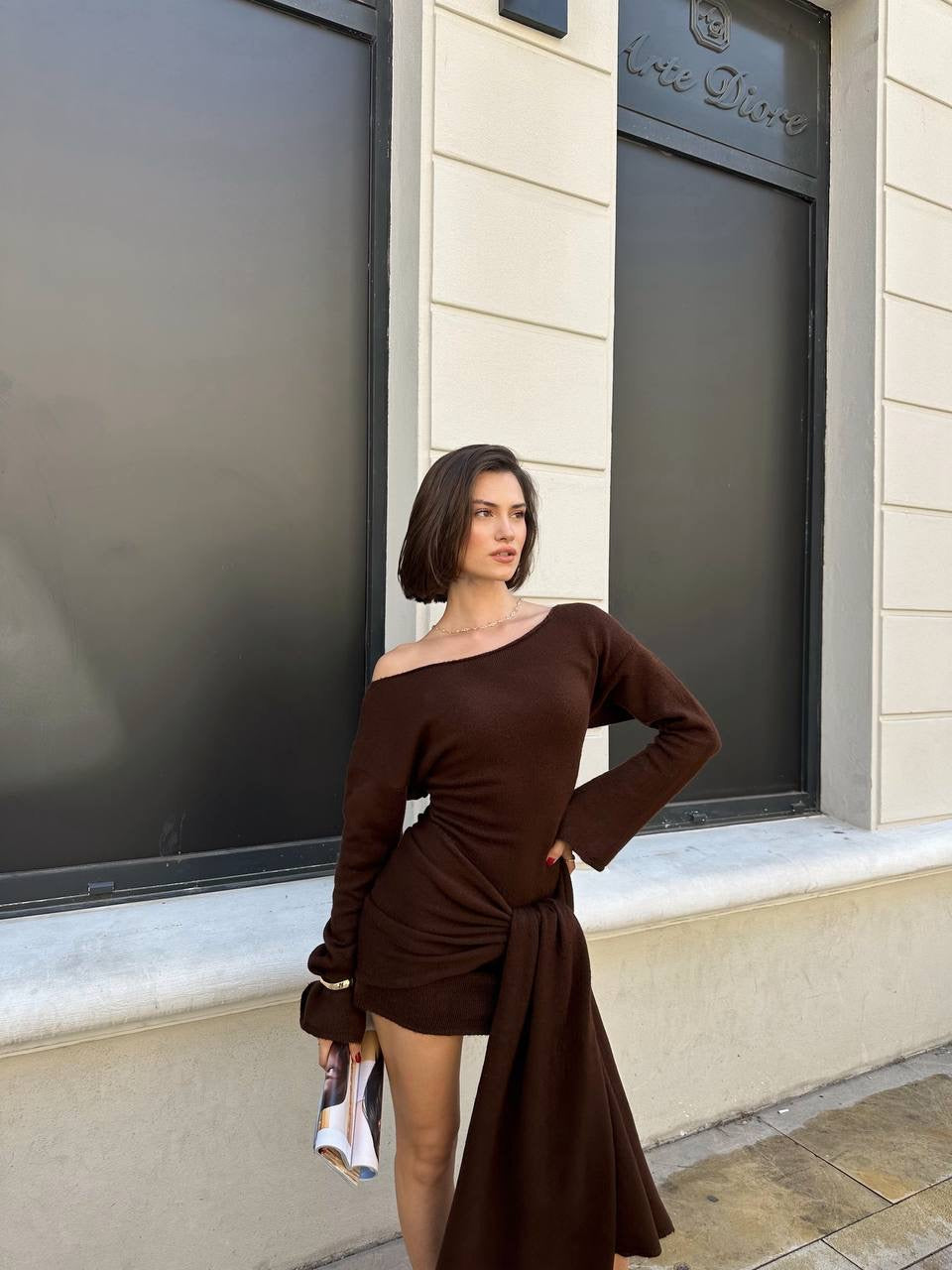 فستان بني ربط مع لفحة - KP1367